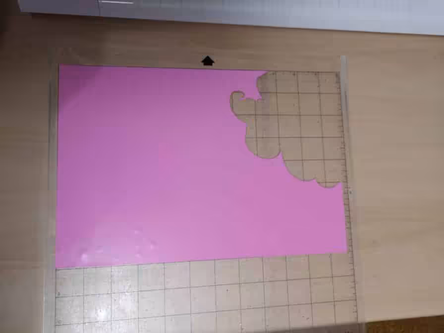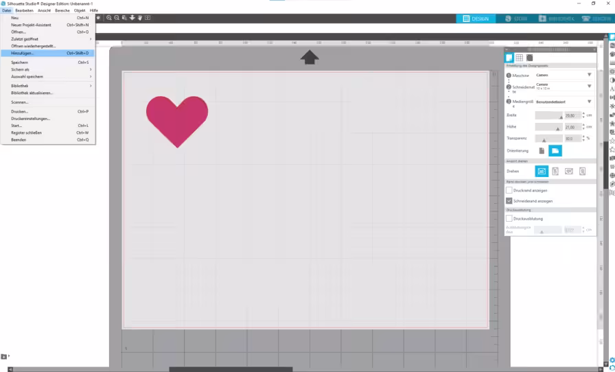 Die Folie kam also nicht auf die Brother-Matte, sondern auf die vom Cameo. Jetzt aber einfach irgendwo oben in der Ecke zu schneiden, wie man das ja meist macht, fand ich doof, weil dann das Reststück eine blöde Form bekommen hätte. (Ja, ich bin da etwas seltsam. Am liebsten habe ich immer annähernd rechteckige Reste, weil ich da am besten abschätzen kann, ob ein weiteres Projekt drauf passt oder nicht.) Das Herz soll also unten rechts in das Stück Folie.