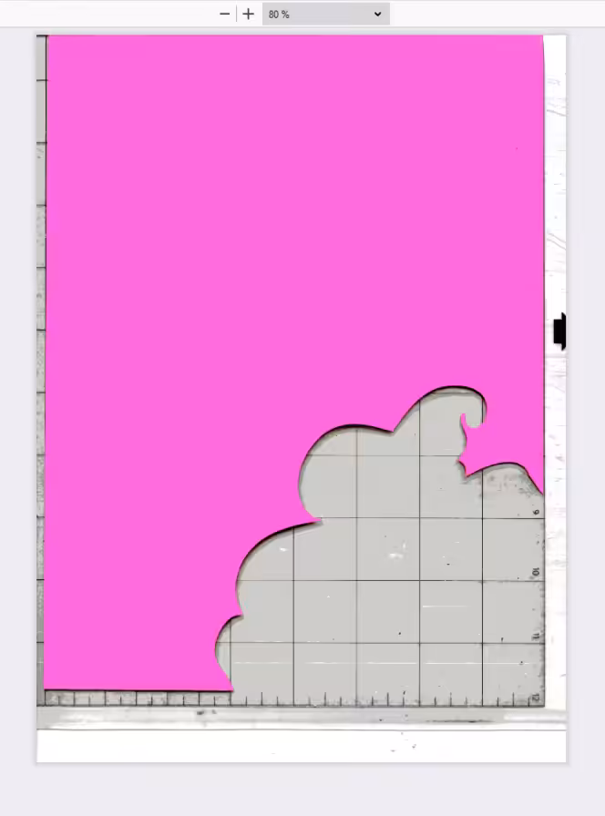 Hier liegt nun also das Herz, man sieht die transparente Anzeige der eingestellten ursprünglichen Foliengröße (ohne die bereits weggeschnittenen Teile, also quasi den „Urzustand“) und den Schneiderand, innerhalb dessen das zu schneidende Objekt platziert werden kann.