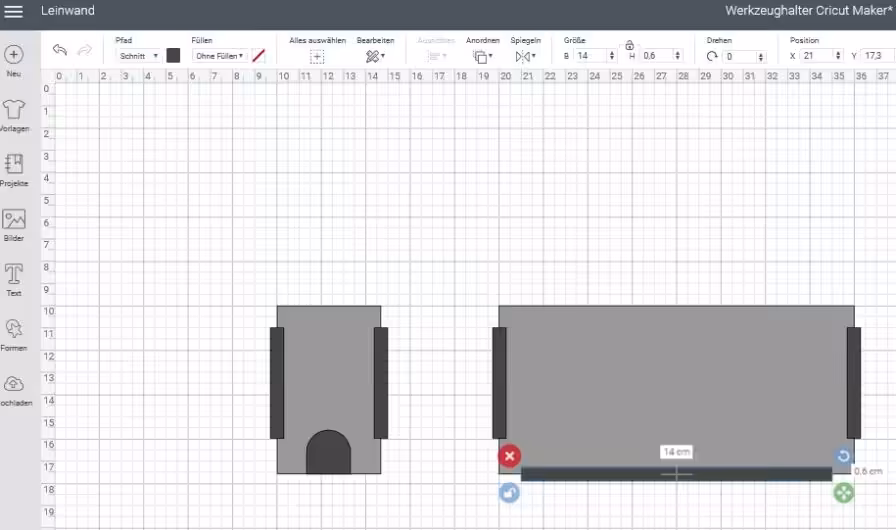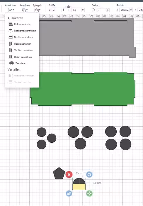 Nun zu den Ausbuchtungen und Einkerbungen. Hier hatte ich im Vergleich zum Silhouette Studio die größten Probleme eine Möglichkeit zu finden, die Formen sauber auszurichten. Meine so heiß geliebten Hilfslinien gibt es hier ja wohl nicht. ABER es gibt die Funktion „Position“ oben in der Zeile über der Leinwand. Diese zeigt an, an welcher Stelle die obere, linke Ecke der Form (bzw eines die Form umgebenden Rechtecks) positioniert ist. Damit, und mit ein bisschen rechnen, lassen sich die Formen auch sehr schön ausrichten. Der x-Wert wird dabei in dem oberen, waagerechten Lineal abgelesen, der y-Wert in dem Lineal an der linken, senkrechten Seite der Leinwand.