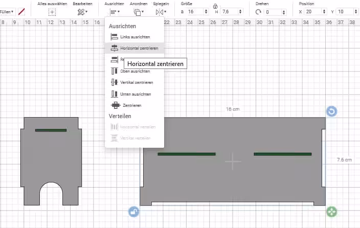 Wir schieben die Schlitze auf die passende Seitenwand, markieren jeweils die Wand und Schlitz(e) und zentrieren zunächst den Schlitz / die Gruppe der beiden Schlitze auf der Seitenwand. (Beides markieren, Ausrichten, Horizontal zentrieren). Das spart das Kopfrechnen…
