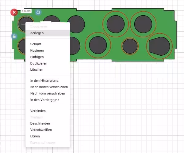 Also jeweilige Seite und Schlitze gemeinsam markieren, und Rechtsklick, Verbinden. Dadurch ändert sich die Farbe der Schlitze, was uns anzeigt, dass sie nun auf der gleichen Matte geschnitten werden, wie die Seitenteile des Halters, und durch das Verbinden auch an der vorgegebenen Stelle auf der Seite und nicht irgendwo daneben. Wenn wir später nochmal etwas verändern wollten, müssten wir nur die Verbindung trennen, und schon funktioniert das.