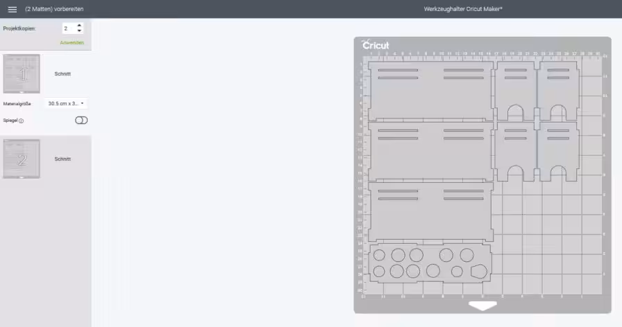 Abhängig davon, aus welchem Material ich den Halter schneiden möchte, muss ich an dieser Stelle dem Programm mitteilen, wenn ich 2 oder noch mehr Projektkopien benötige.