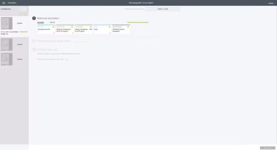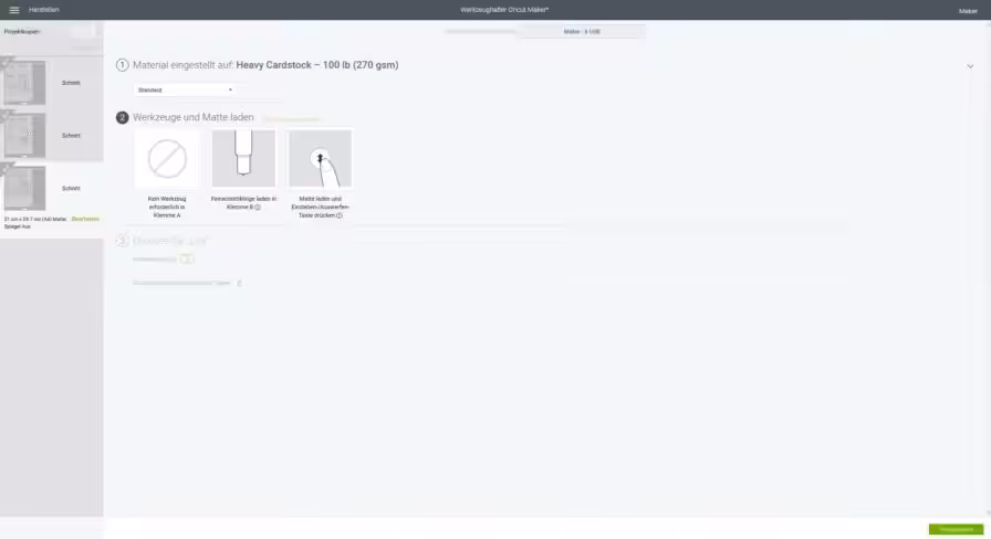 Hier kann ich mein Material auswählen und ggf. noch Änderungen an den Schneideeinstellungen vornehmen. Ich entscheide mich für Heavy Cardstock – 100 lb (270 gsm), da mir dies am ehesten meinem Material zu entsprechen scheint.