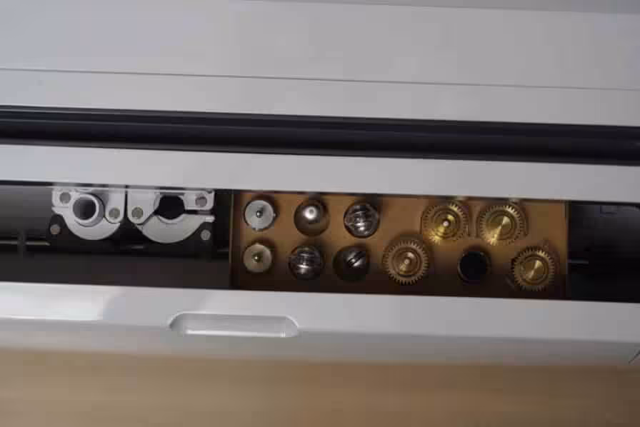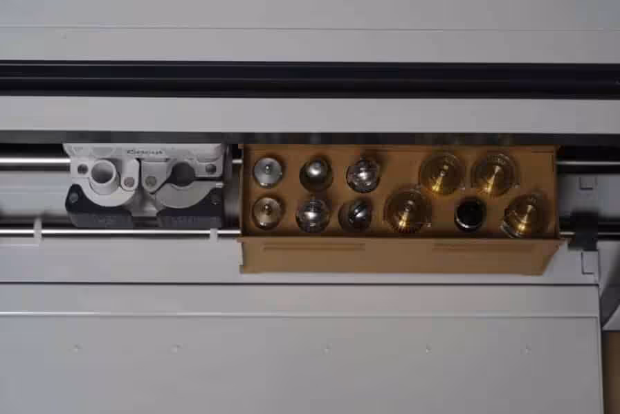 die Tips 11 (Perforieren) und 31 (Wellenschnitt) jeweils mit Schutzkappe kommen in Ausschnitte mit einem Lochdurchmesser von 1,7 cm. Dieser wird nur in der oberen Ablageebene ausgeschnitten.