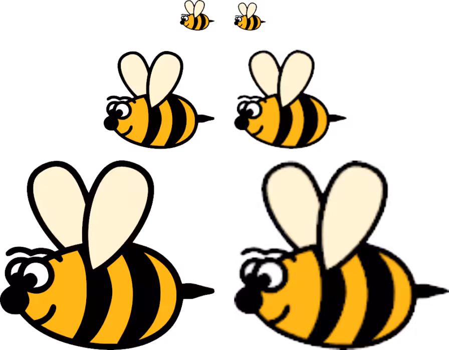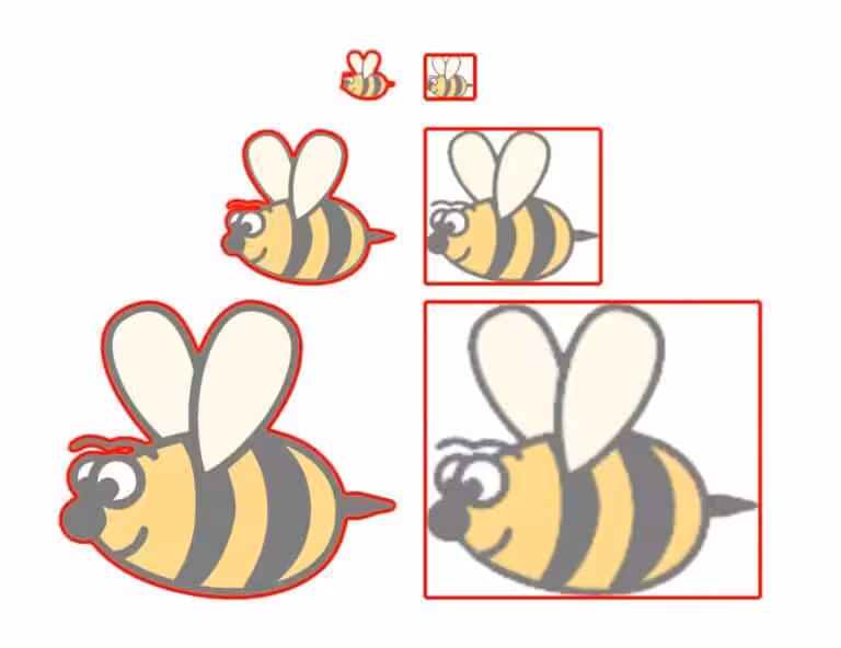 Hier sieht man mal zum Vergleich den Unterschied, wenn dasselbe Motiv einmal als Vektor (links) und einmal als Pixelgrafik vergrößert wird. Die linken Motive bleiben klar und glatt, während bei den rechten Motiven mit zunehmender Vergrößerung der „Treppeneffekt“ sichtbar wird, da hier lediglich die einzelnen Pixel vergrößert werden, während ja bei den Vektorgrafiken für jede Größe neu berechnet wird, wie die Ränder und Farben im Verhältnis zueinander anzuordnen sind.